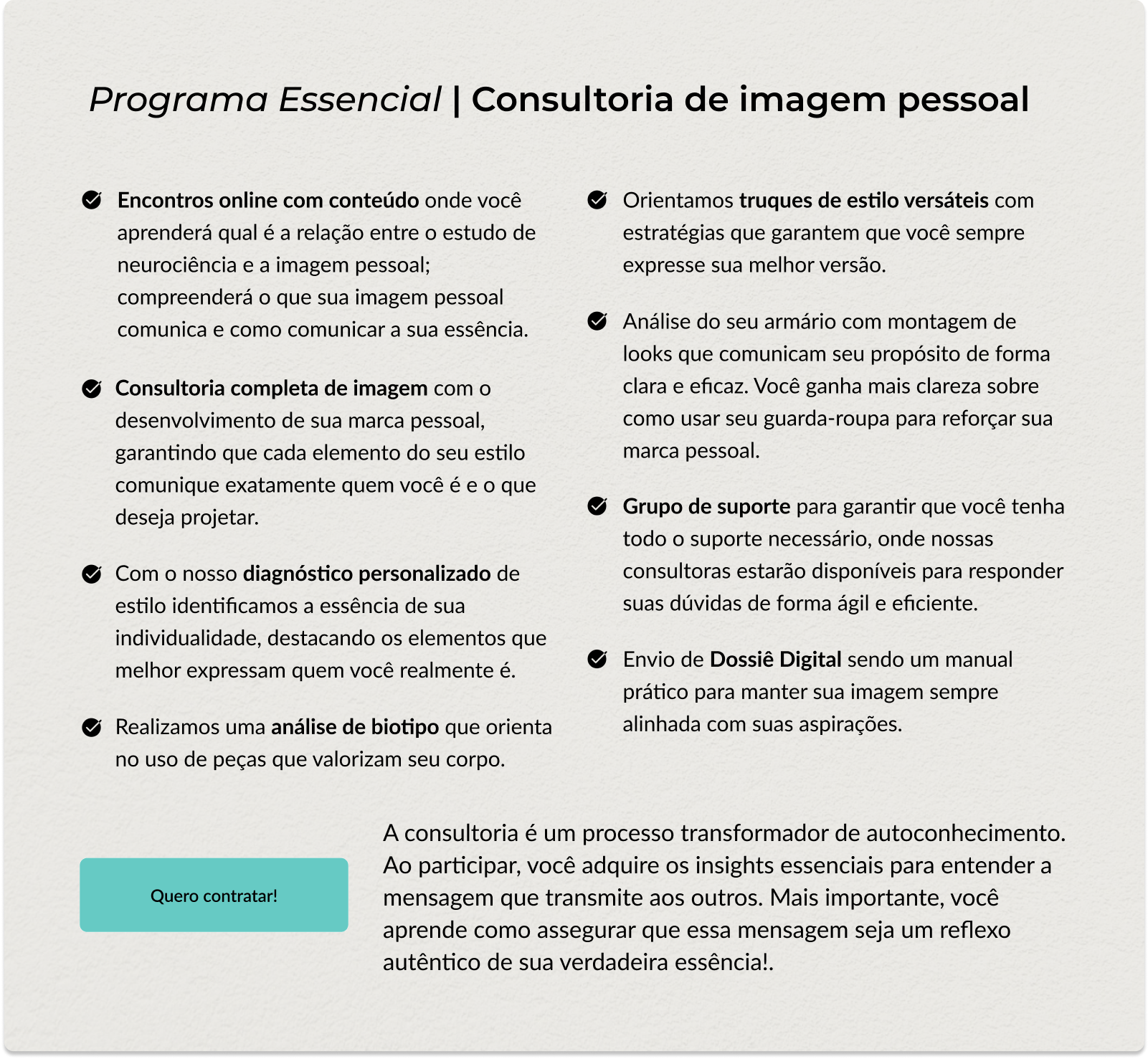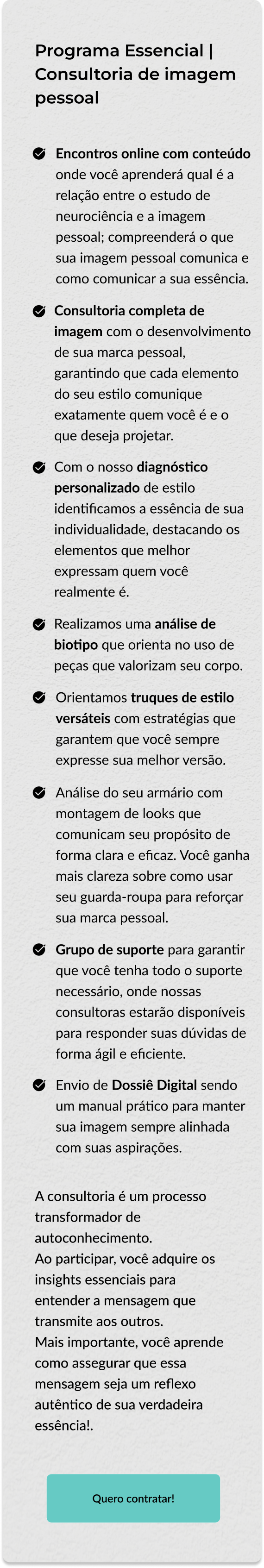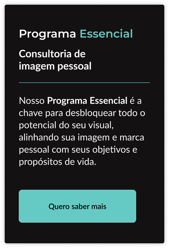 Nossos programas foram projetados para lapidar e projetar sua imagem pessoal de forma que ela comunique efetivamente a sua essência. Com um enfoque personalizado e estratégico.