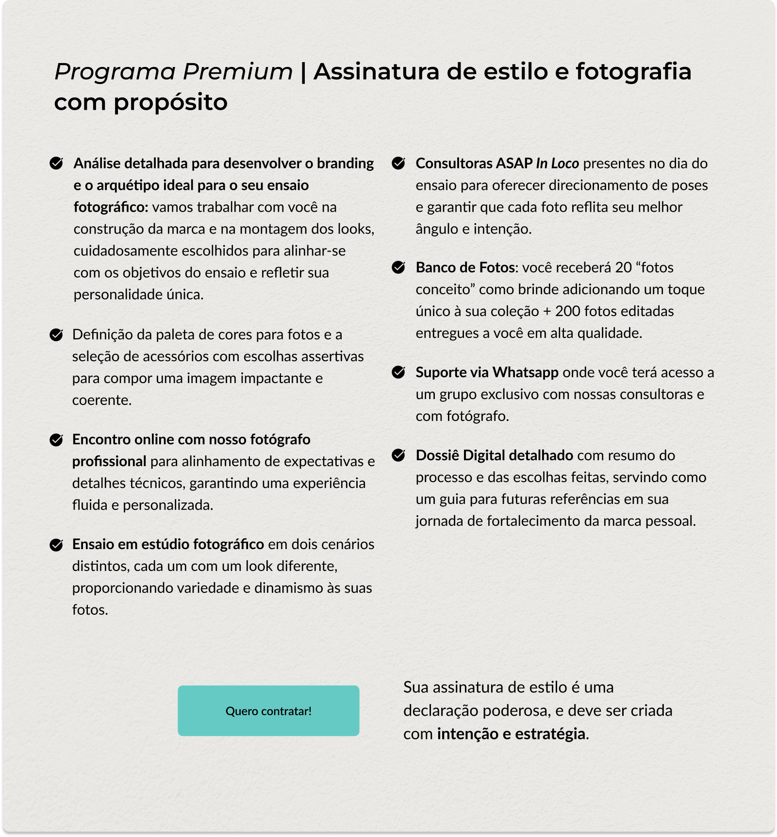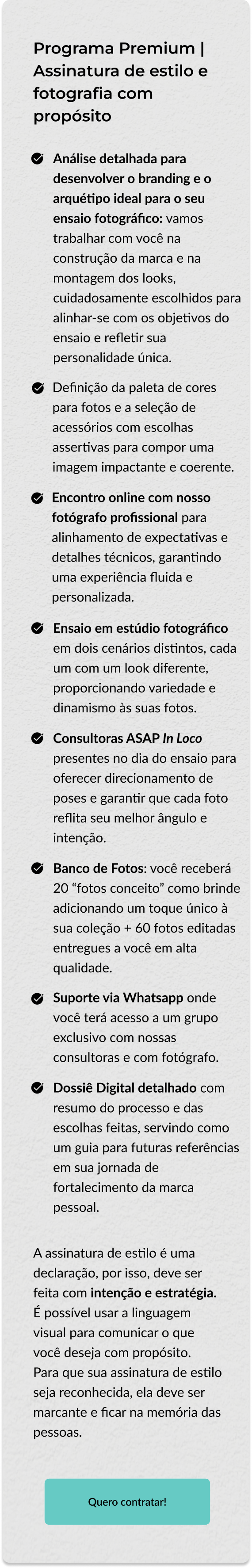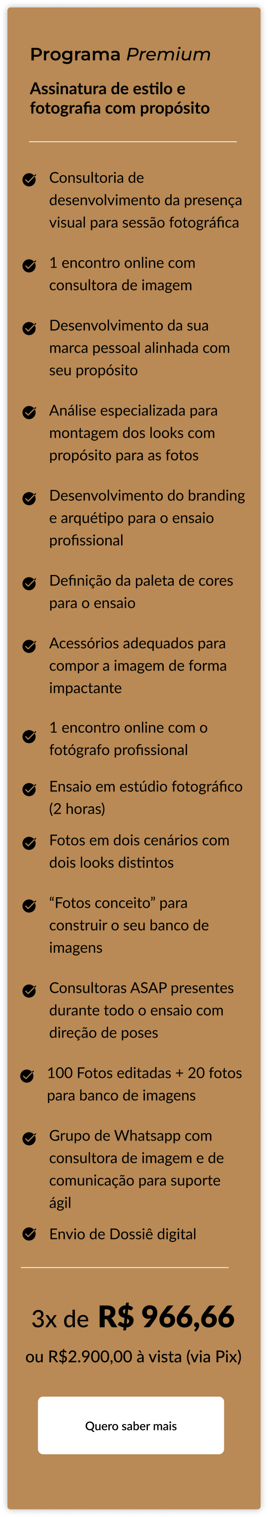 Nossos programas foram projetados para lapidar e projetar sua imagem pessoal de forma que ela comunique efetivamente a sua essência. Com um enfoque personalizado e estratégico.