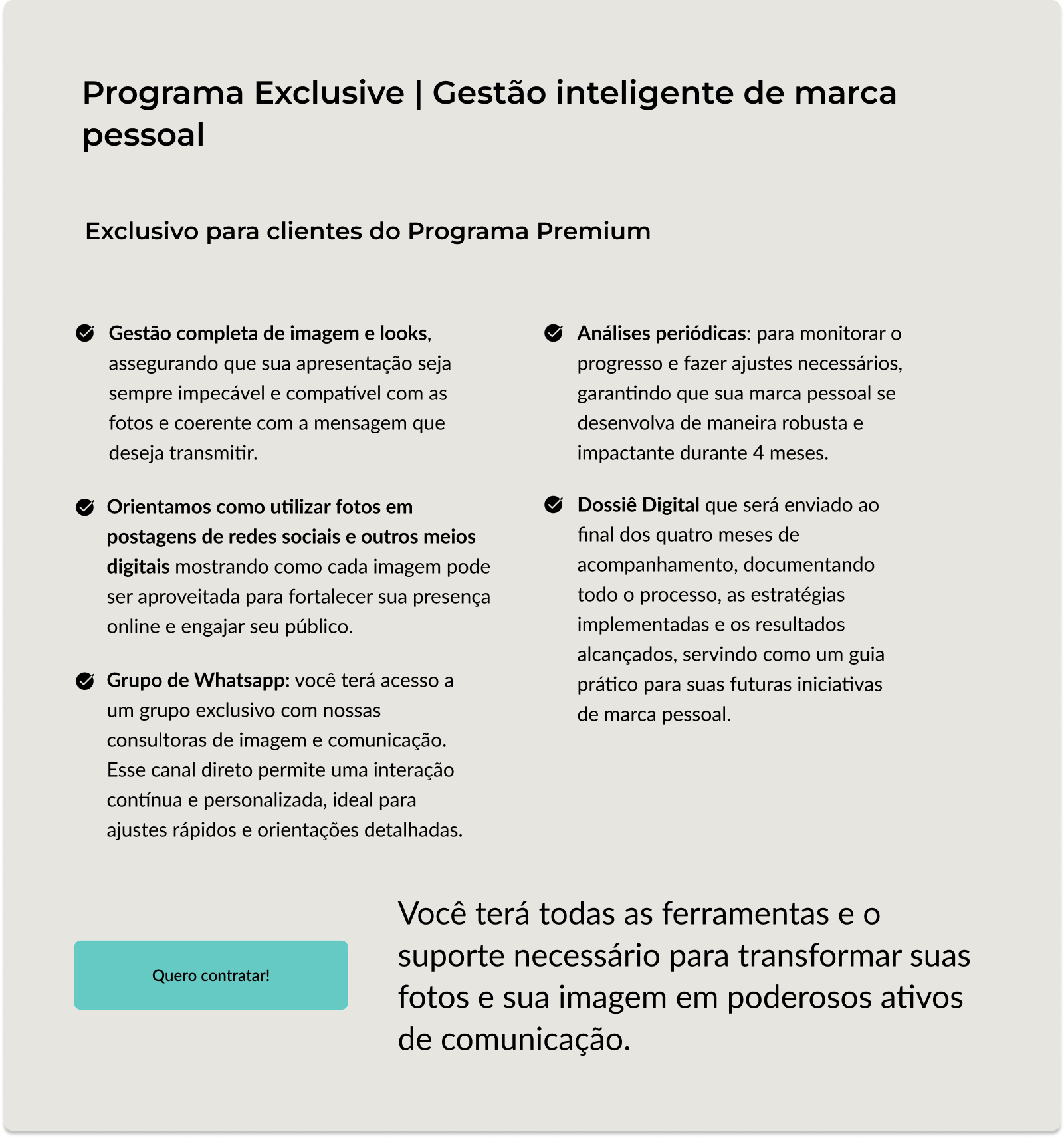 Nossos programas foram projetados para lapidar e projetar sua imagem pessoal de forma que ela comunique efetivamente a sua essência.