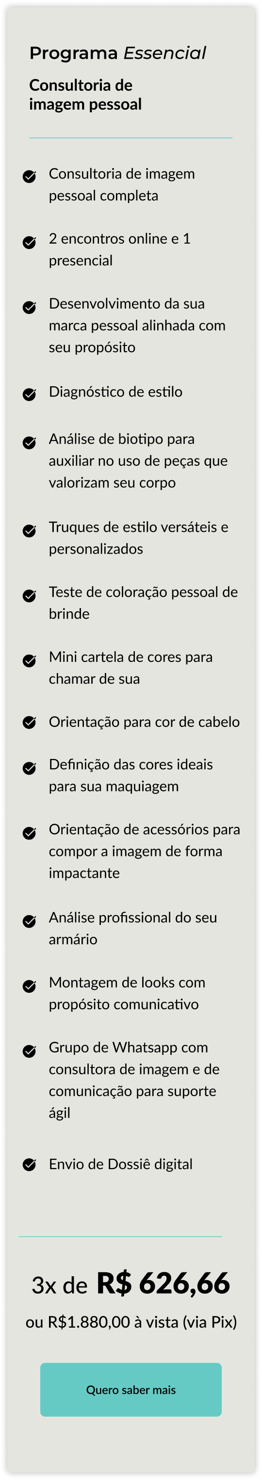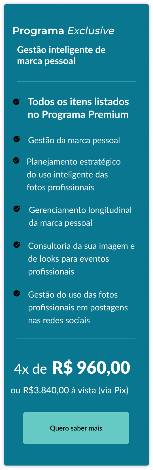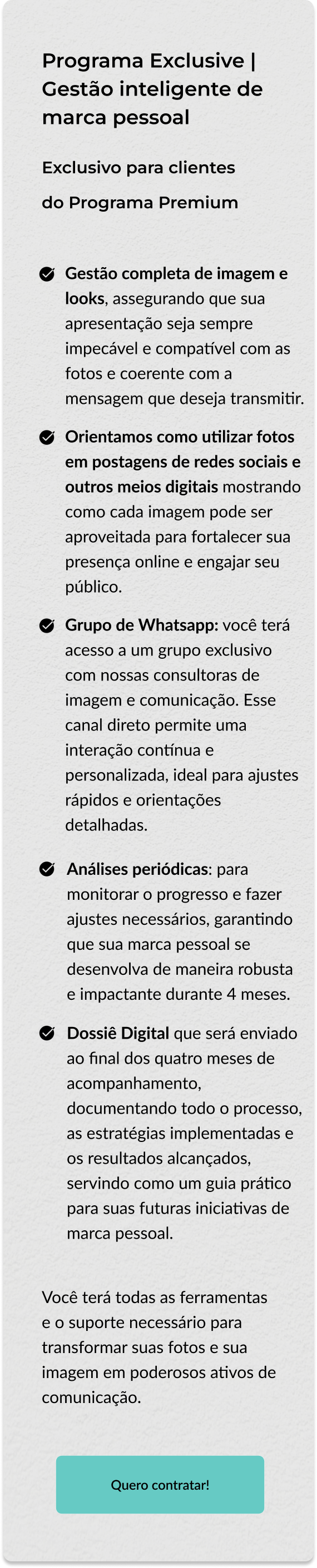 Cuidar da imagem pessoal significa fazer com que suas melhores qualidades sejam percebidas pelas pessoas ao seu redor. Isso só gera benefícios! Manter uma imagem pessoal consistente ajuda a reforçar sua marca pessoal, aumentando a percepção de profissionalismo e tornando você memorável e reconhecível, o que é vital para o avanço na sua carreira.